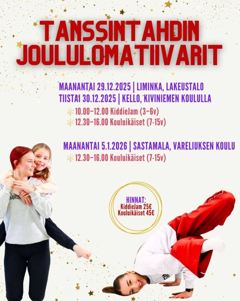 Joululoma saa tänäkin vuonna pienen mausteen tanssista, kun TanssinTahdin suositut joululomatiivarit tulee taas. Viime vuoden tiiviskurssit keräsivät upean joukon innokkaita tanssijoita, ja toiveiden perusteella järjestämme kurssit jälleen kolmella paikkakunnalla: Limingassa, Kellossa ja Sastamalassa.